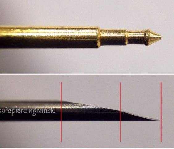Теперь мы рассмотрим иглы. Если не углубляться в теорию о заточке, игла для пирсинга имеет острую режущую кромку, которая делает аккуратный разрез и вспомогательную кромку, которая дотягивает разрез до круглого отверстия (на фото части режушей кромки разделены красными линиями). Чем меньше угол заточки (больше длина), тем плавнее растягиваются ткани, меньше трение, а значит и меньше боли при проколе.